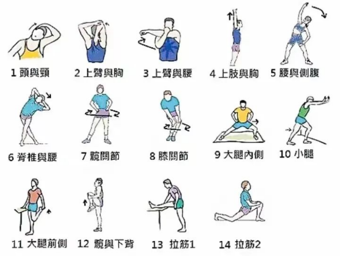 4.热身准备:运动员们在比赛前应进行适当的热身运动,以减少肌肉拉伤和其他运动损伤。赛前活动腰部与四肢,可以提高肌肉的力量、弹性和灵活性,同时可以提高关节韧带的机能,增加韧带的弹性,使关节腔内的滑液增多,从而防止肌肉和韧带的损伤,减少扭伤的发生。